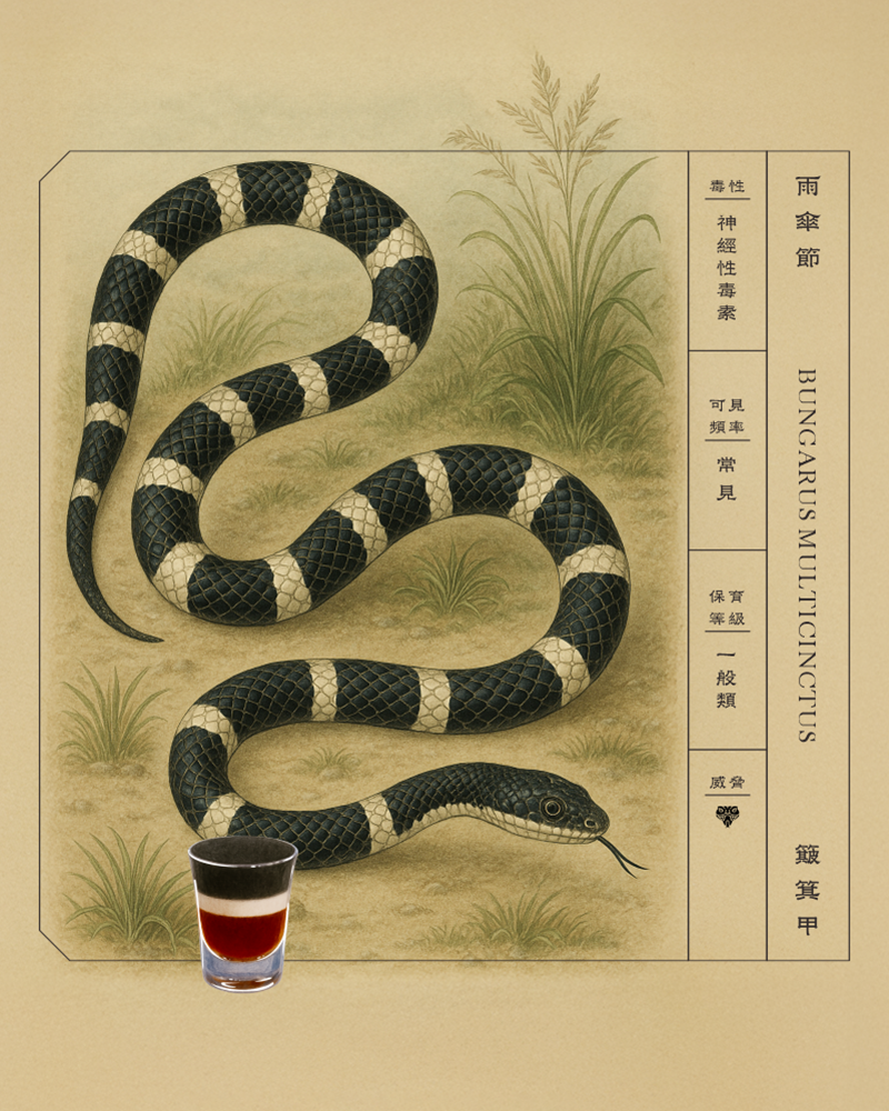 恐懼往往源自於未知與偏見,當我們開始理解這些毒蛇的習性與特質,便能轉化為敬畏與尊重。邀請您到鯤島,舉杯暢飲這組調酒SHOT,品味生命的多樣性,用全新的眼光,看待與我們共享土地的美麗生物,擁抱這個世界的每一種姿態。